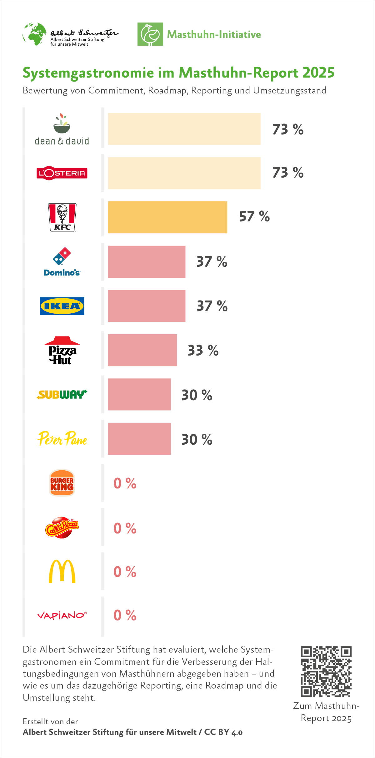 Die Analyse von fünf Schlüsselbranchen der Lebensmittelwirtschaft belegt deutliche Fortschritte bei einem Teil der Marktakteure. Unternehmen mit verbindlichen Selbstverpflichtungen, detaillierten Umsetzungsfahrplänen und transparenter Berichterstattung zeigen messbare Erfolge. Aldi Nord und Süd, Rewe, Lidl, Penny, Globus, Hans im Glück, Tegut, Dr. Oetker, Plukon, PHW und LDC setzen die Kriterien der Masthuhn-Initiative um und demonstrieren damit: Höhere Tierschutzstandards sind in der Praxis realisierbar.