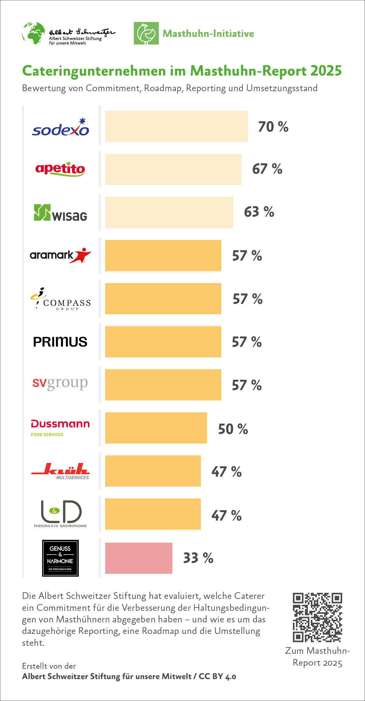 Für den neuen Masthuhn-Report 2025 hat die Albert Schweitzer Stiftung erstmals den Lebensmitteleinzelhandel, die Systemgastronomie, Caterer, Hersteller und Produzenten nach einer einheitlichen Methodik bewertet.