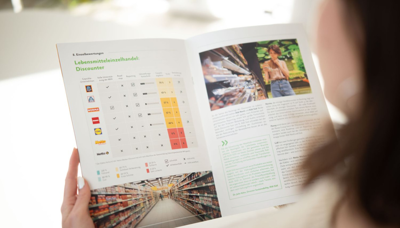 Im Ranking der Supermärkte belegt Globus in diesem Jahr den Spitzenplatz. Mit einem Score von 77 % zieht das SB-Warenhaus am Konkurrenten Tegut vorbei, der mit 73 % leicht zurückfällt – unter anderem, weil sich dessen Commitment bislang nur auf Frischfleisch bezieht.