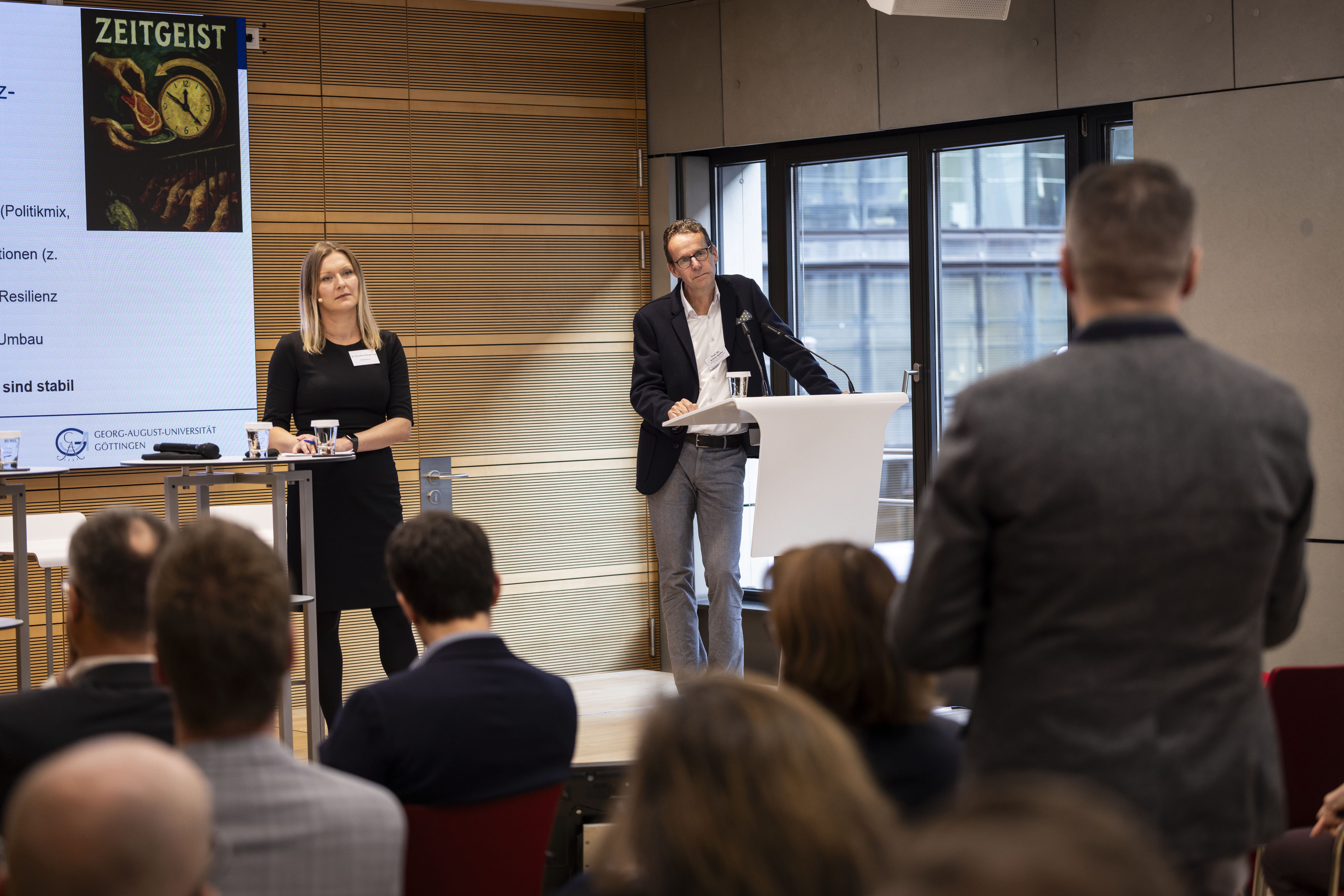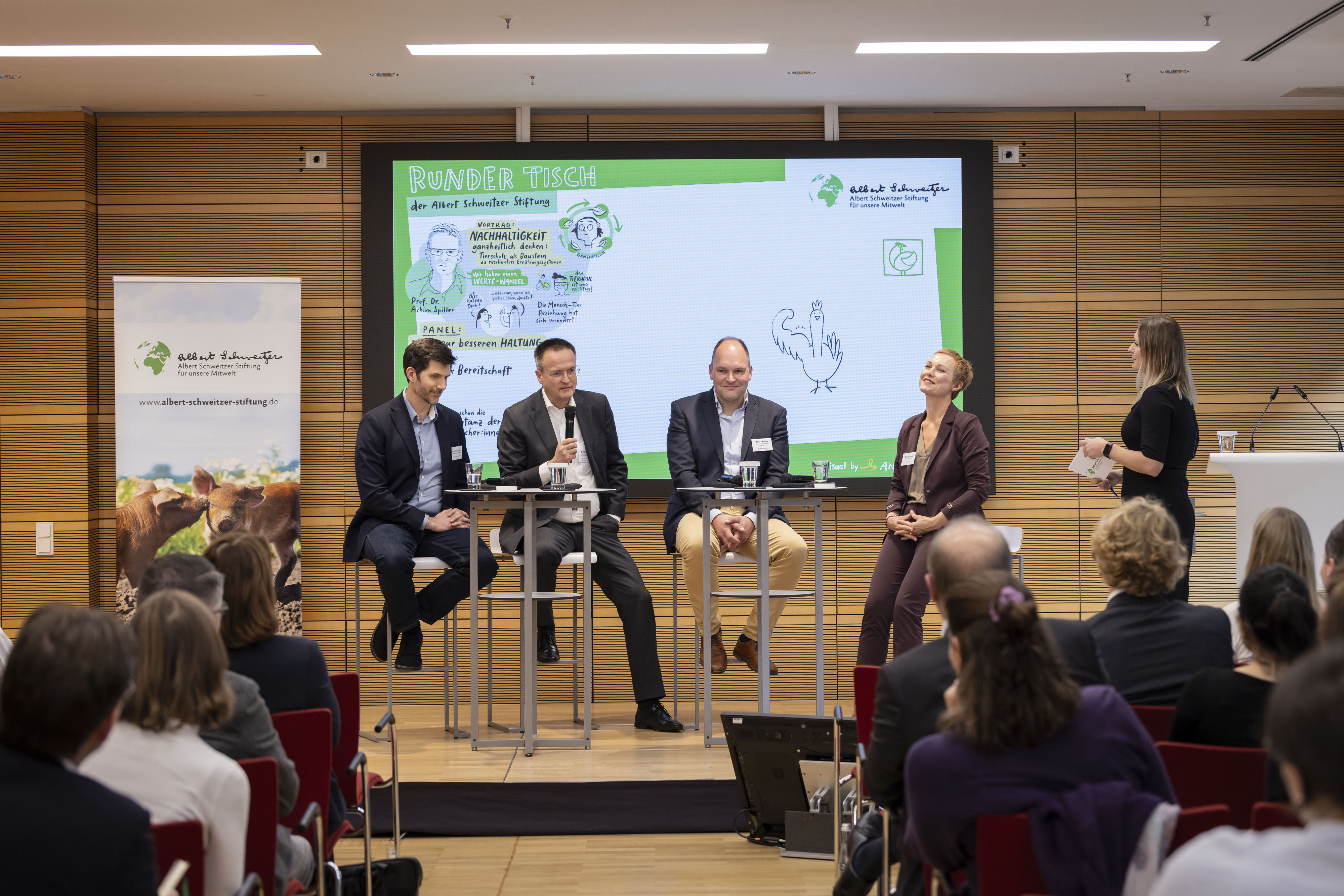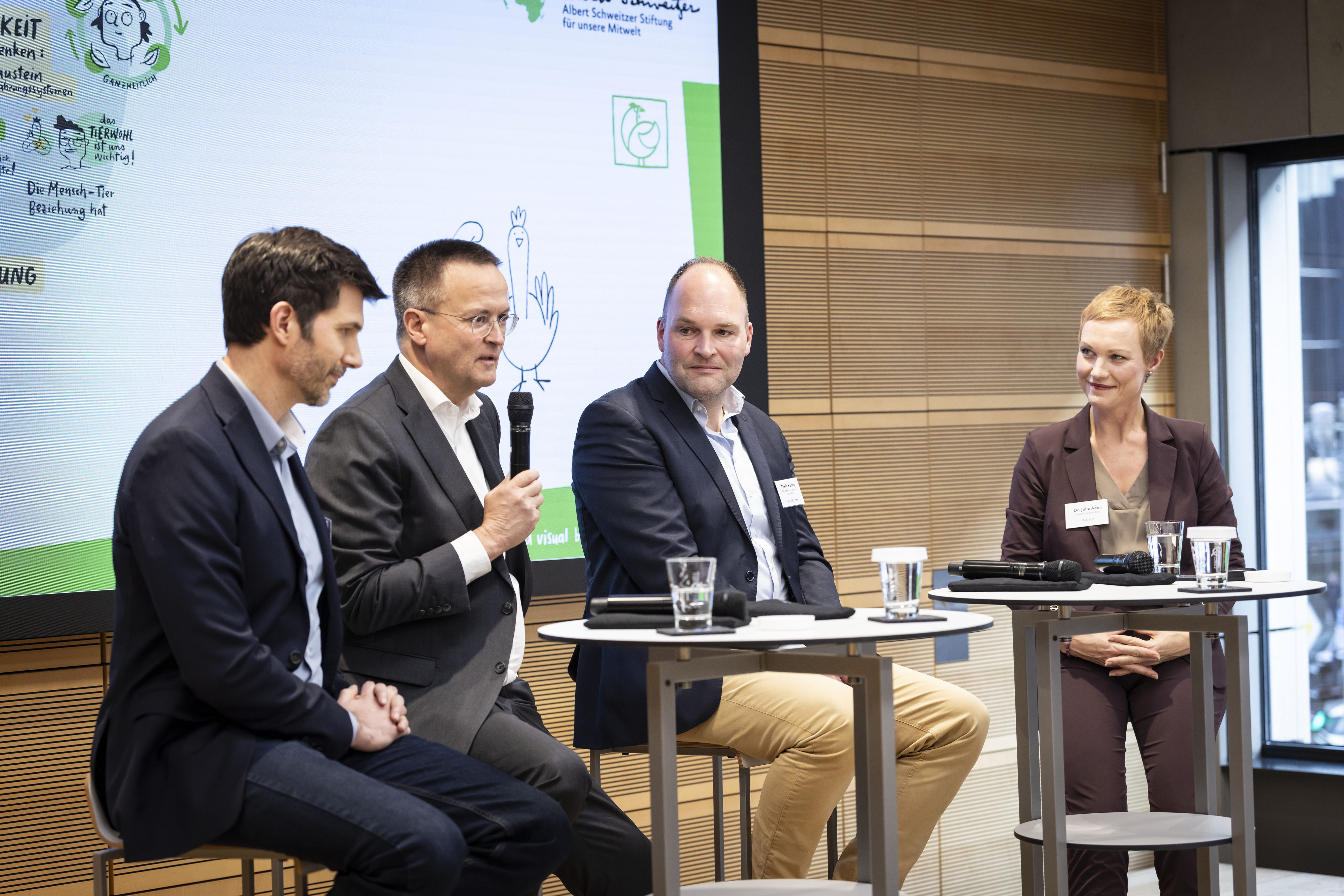 In der Podiumsdiskussion mit Dr. Julia Adou (Aldi Süd), Theile Funke (Wiesenhof), Dr. Hinrich Snell (BMLEH) und Mahi Klosterhalfen (Albert Schweitzer Stiftung) wurde deutlich: Unternehmen treiben den Wandel aktiv voran, stoßen aber weiterhin auf politische Hürden. Einigkeit herrschte über die Bedeutung des kommenden Tierhaltungskennzeichnungsgesetzes als wichtige Chance für mehr Transparenz und Planungssicherheit.