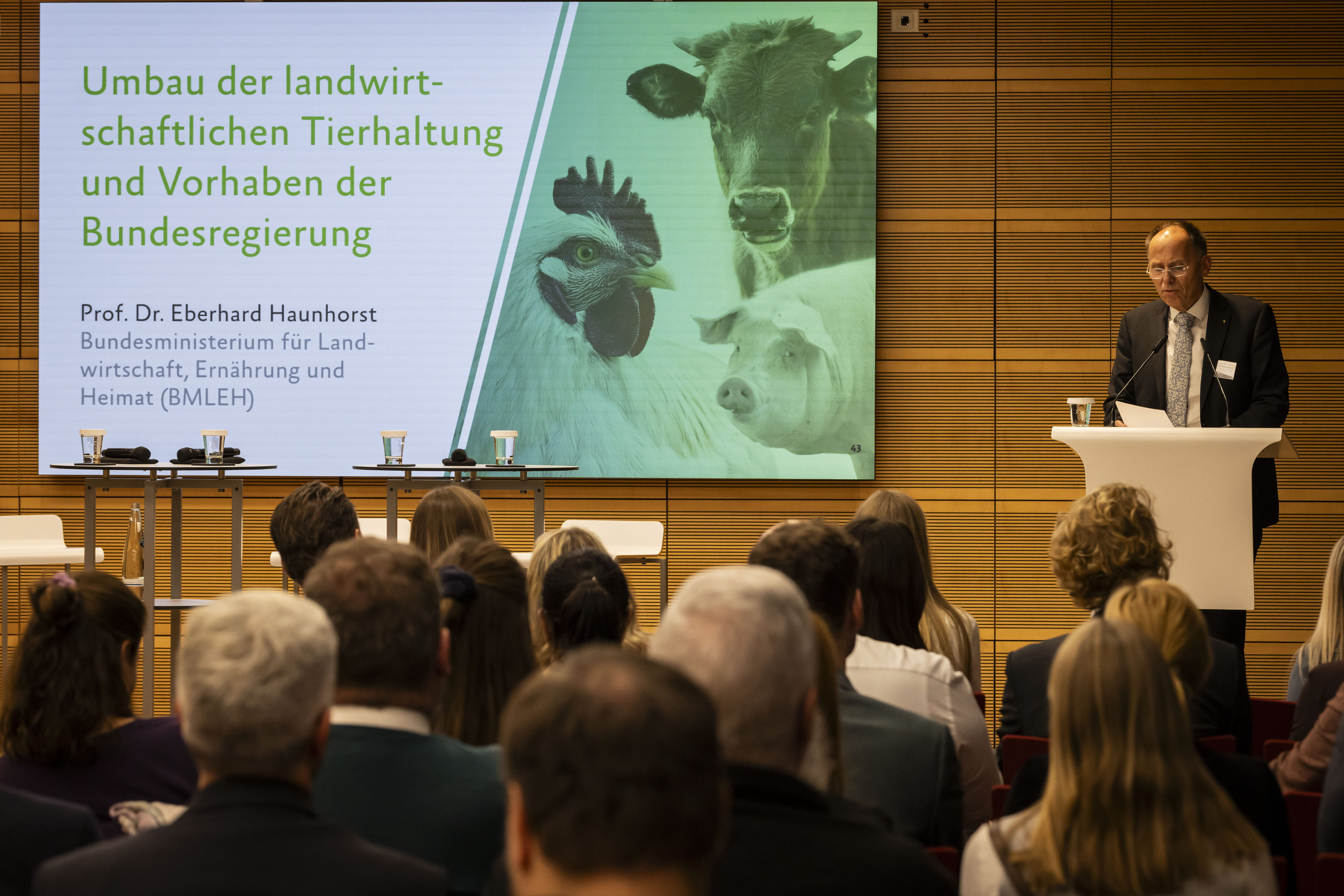 Zum Auftakt des Parlamentarischen Abends betonte Prof. Dr. Eberhard Haunhorst (BMLEH), dass Tierschutz weiterhin fest auf der Agenda der Bundesregierung steht. Ziel sei es, den Umbau zu fördern, Baumaßnahmen zu erleichtern und ein wirksames Tierhaltungskennzeichnungsgesetz zu etablieren.