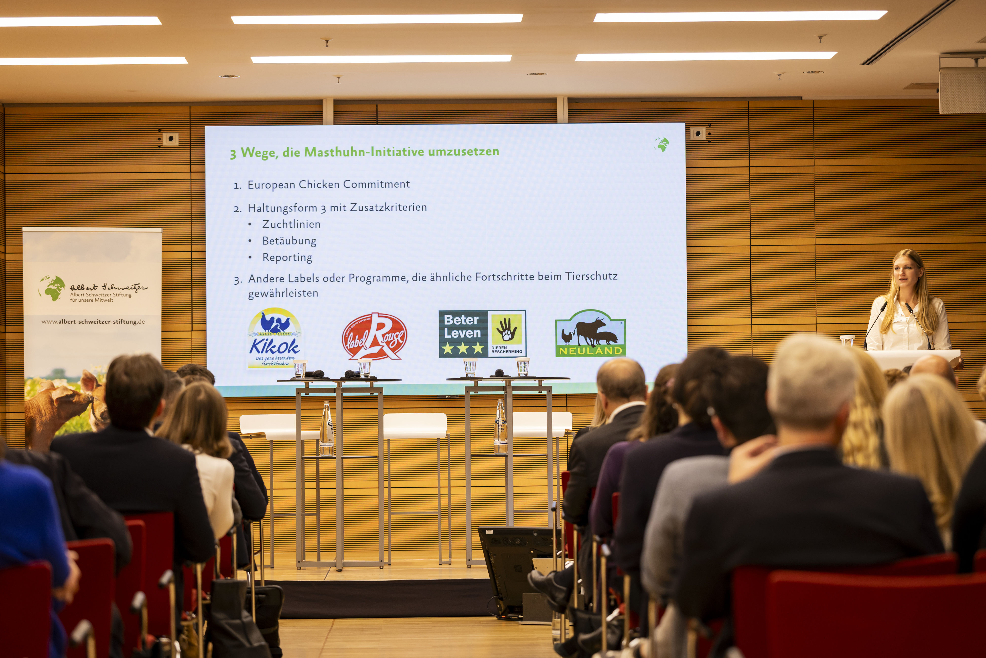 Am Nachmittag zeigte Esther Erhorn, Leiterin Lebensmittel-Fortschritt der Stiftung, wie die Masthuhn-Initiative strukturelle Verbesserungen und verlässliche Kennzeichnungen verbindet.
